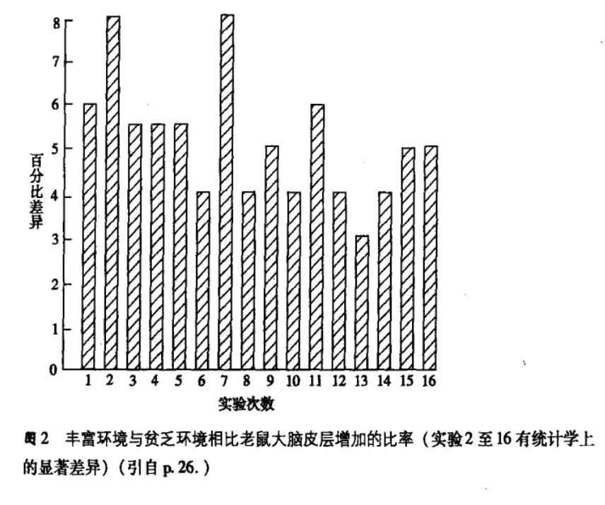 罗兹维格和他的同事解释说:“虽然由环境引起的大脑变化并不很大,但我们确信这种变化是千真万确的。在重复实验的时候,上述结果仍然出现……我们发现,经验对大脑最一致的影响表现在大脑皮层与大脑的其余部分(即皮层下部)的重量之比。具体表现为,经验使大脑皮层迅速的增重,但大脑的其他部分变的很小。”这种对大脑皮层与大脑其余部分的比率的测量是对大脑变化最精确的测量。这是因为每次老鼠的脑容量会随动物体重的变化而变化,用这个率,可以消除个体差异。图2用图表说明了16次实验的结果。正如你所看到的,只有一次结果的差异在统计上不显著。